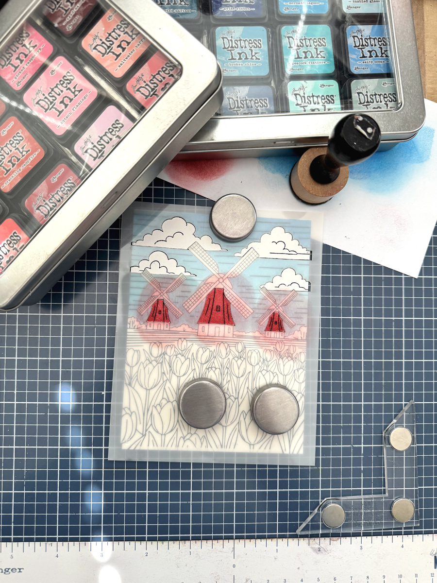 Then I colored using the coordinating stencils, Distress ink pads and mini ink blending tools. So easy and FUN!