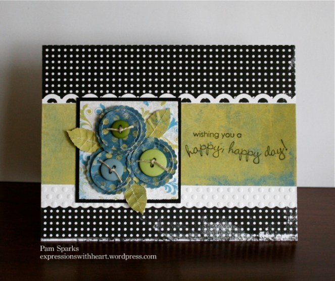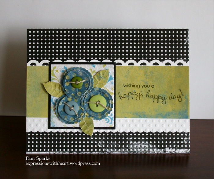 Then,  I had to try out the Spellbinders  scallop dot border die that’s been laying there on the desk taunting me….oh and the Sizzix button die hadn’t been used yet either!  Just kept thinking it’d make cute flowers!  The leaf is the Martha Stewart rose petal punch.  The wishing you is a Penny Black stamp.  Buttons are from a long time ago, a  Making Memories case of buttons.