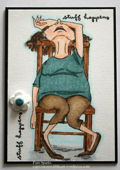 Madge is a rubber stamp from Art Impressions.  Stuff happens is from Wordsworth.  I colored Madge w/copic sketch markers….almost looks like she was having a bad hair day! lol  I’m sure she’s thinking about how splotchy her skin is too!  hehehe