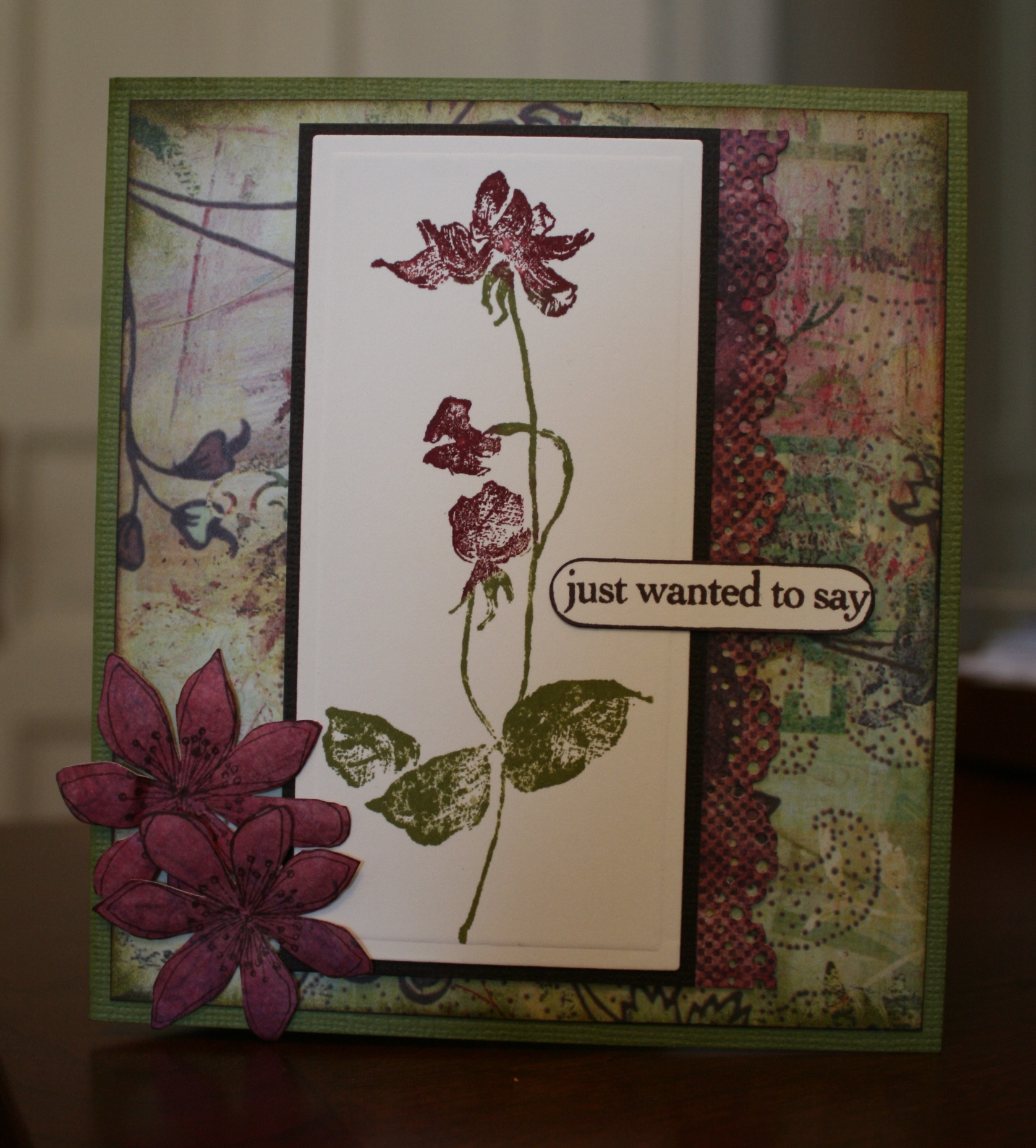 IMG_0831Penny Black flower stamps,  Cosmo Cricket Fleuiste pattern paper and Martha Stewart’s scallop lacy border punch were used to make this “just wanted to say”  card. I have to say the elongated nestabilities rectangles are some of my favorite dies!  Oops! I almost forgot the SU word window punch!