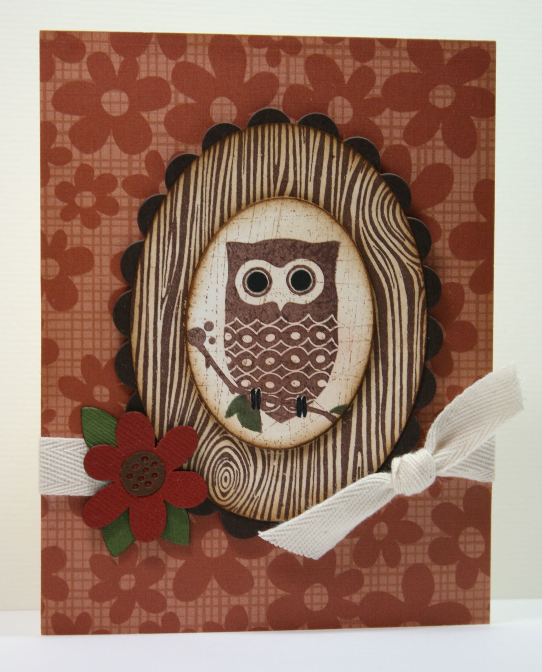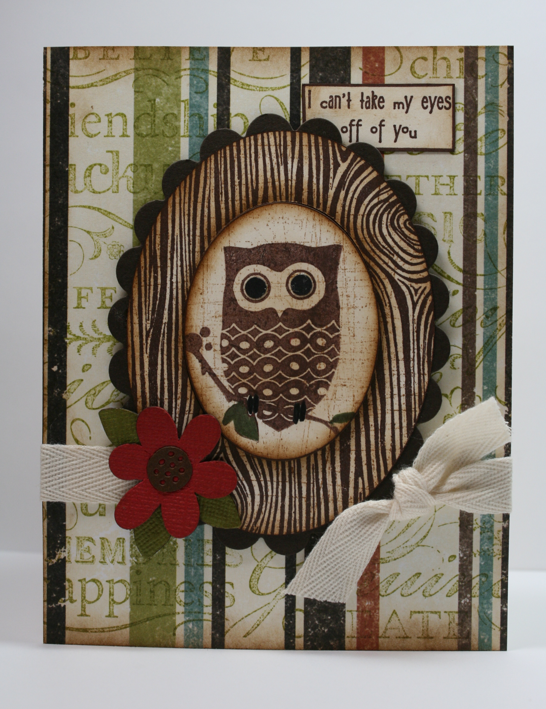 My favorite Owl cardsovalInkadinkado Owl clear stamp,  All Night Media wood grain (I purchased mine at Michaels),SU word & sanded background stamps,  Rubber Soul – eyes stamp,  Nestabilites oval dies, QK flower, twill and We R Memory Keepers pattern paper.owlVS2Chatterbox pattern paper…