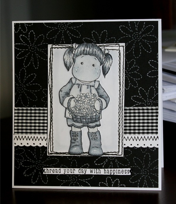 Gosh I have never seen anyone do a black and gray Tilda and card before! It must have been quite a job. I am going to check out the Tutorial and try it myself when my colours come. This is really quite awesome. I love the stitching – it looks like real stitching! Great paper – great card!