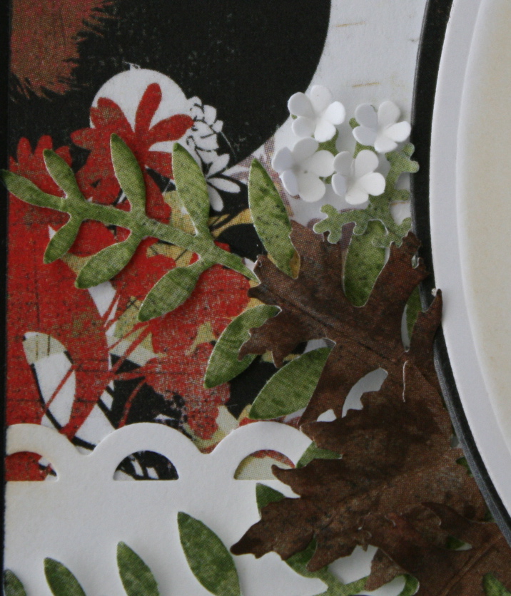 Leaves punched, distressed and the Martha Stewart Cosmo flower punch with a Making Memories rhinestone brad in the center finish off the punched elements.