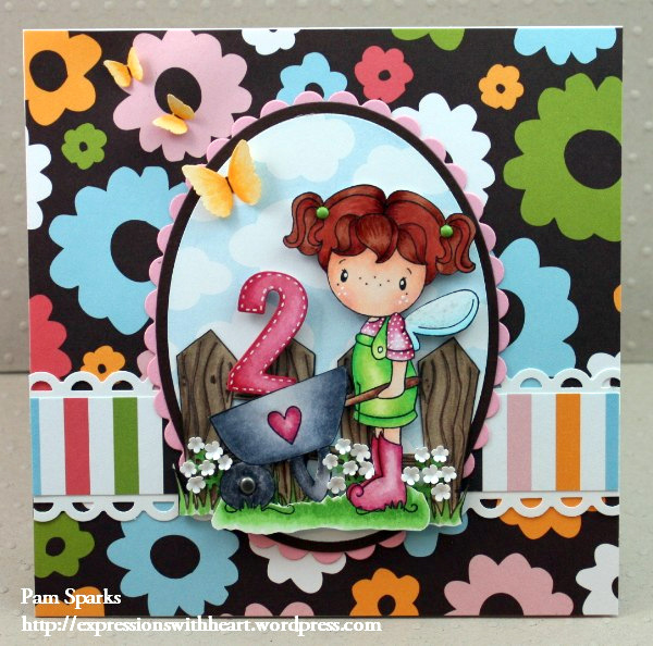 I am just lovin’ how this turned out!  Leisel for Lizzie Faith,  one of our granddaughter’s  that just turned two yesterday.  Leisel and her wheelbarrow is from CC Designs,  just the cutest thing…yep,  there’s my signature little white flowers too!  Colored with copic sketch markers. Hope she makes you smile!