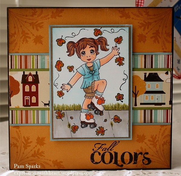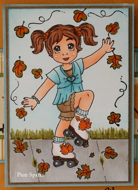 Doesn’t this make you think “Indian Summer”?  Well,  I hope we get one!  a LONG one!!!  This is Inky Impressions new Lili roller skating…so cute in her ta da stance!  Stamped with Memento Tuxedo Black ink and  colored  with copic sketch markers, drew in the sidewalk and grass.  The falling leaves is part of a Magnolia of Sweden stamp.  I used my stamp a ma jig and stamped it in parts here and there around Lili. The corner stamps and sentiments by Inkadinkado here and here, are clear stamps…the small sets and stamped up great with Versafine ink.  I tried the Toffee color in the corners and really liked it on this Stampin Up card-stock. The pattern Papers are October Afternoon…love them!!!