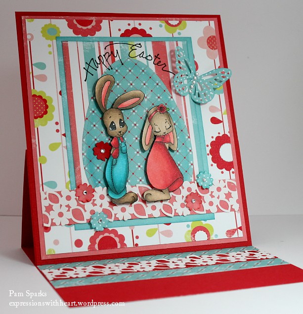 I am in love with Amy Young’s Sweet November Easter stamps…just adorable critters! I used April and Peter from All That Scraps for this easel card today.
