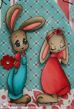 4. WOW Pam, your coloring of April and Peter is amazing! And your paper choice adds such fun to the card! Perfect embellies, I especially like the flower he has behind his back! Jast an all around AWESOME card!