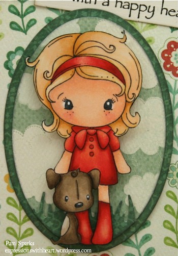 1. OMGosh! she is adorable, I LOVE her! I just adore this card, looking at it does my heart good! Love your DP choices, Kiki’s cloud background, and your stitches. I’ve been stitching only with rub ons, I really gotta try it with my sewing machine one of these days. Another great card Pam, LOVE this!!!