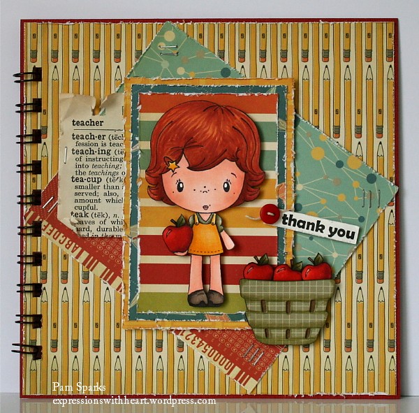 I used the sketch from last weeks Cute Card Thursday challenge for my Teacher booklet… I bound it with the bind it all, brown 3/8 in. Owires and it’s going to my daughter to keep track of the books the children read this year.  The pattern paper is a Cosmo Cricket 6×6 pad, an old dictionary page,  tiny attacher staples,  Quickutz apple basket, button and the  “thank you” sentiment is HERE.  A great set of Fall sentiments.  The apples in the basket are the apple that Honey is holding.  I just stamped that area three times,  cut them out and colored them.