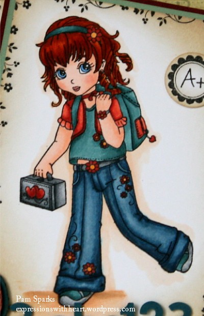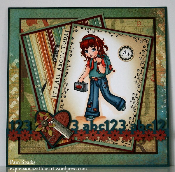 Nickie Running Late For School is stamped with Memento Tuxedo black ink and colored with Copic Sketch Markers. The ruler charm is from Inky Impressions…awesome charms, HERE. The sentiment stamp is from Hero Arts, the “class notes” and A+ are from a dollar clear stamp set and the floral border stamp is from a Stampin Up Tag set. abc123 border is a Martha Stewart border punch, the flower border is an EK Success border punch. The hearts are from a Quickutz die…cut mulitple times and layered up to be like chipboard. A Marvy daisy punch and the branch is a die from Joycraft. The little button is from Lasting Impressions for Paper and the cord from JoAnns. Pattern Papers are from the Recess 6×6 pad by Basic Grey.