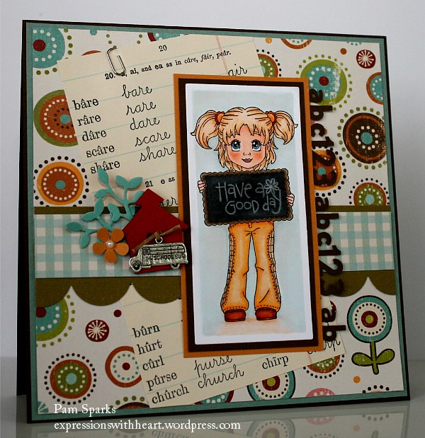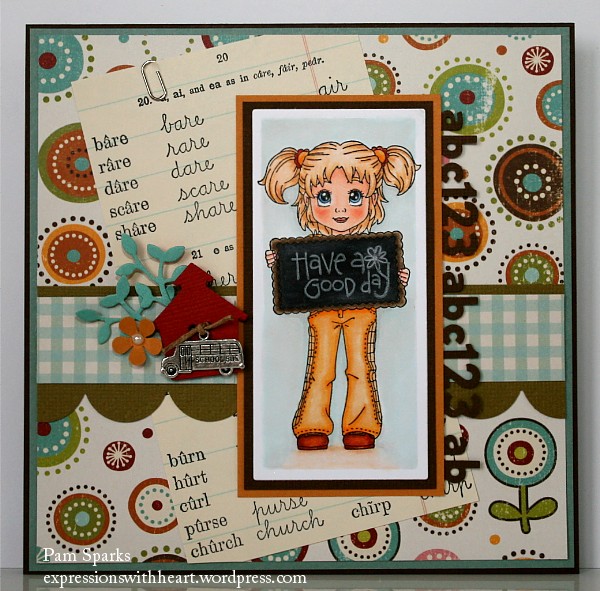 Awesome card Pam! Love the color of her pants. LOL The chalk board is the bomb!!! Love the school bus charm ( even if I HATED riding one)! Love that spelling list!!! Awesome all the way around.