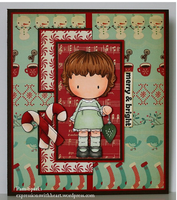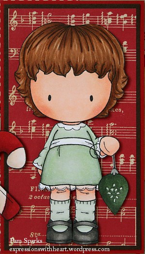 I used Sugarplums Trim the Tree from the new Christmas kit…stamped her with Memento Tuxedo Black Ink on Beckett Expression 80# card-stock and colored her with Copic Sketch Markers. Hair E30’s, Dress G40 and picked up G85 with W00, Shoes warm grays, ornament G85 and BG99, Candy Cane E50 & 51 R27, 29, 59, Skin E50 all over, E000 all over, then E00 in a way, then E01 to shadow. Diluted R20 picked up with E00 for her cheeks. The sentiment and candy cane are CC Design stamps.  The pattern paper is Cosmo Cricket.