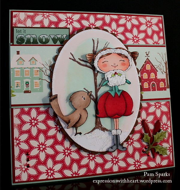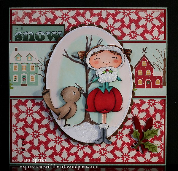 10. Pam I don’t know where to begin with this. I know I say this about all of your work, but this is simply amazing. You couldn’t have paired her more perfectly with this paper. It’s one of my favorites. Brilliant idea using the tree from CCD. You have such an eye for the details, and believe me they are truly appreciated by us “fans”!! My absolute favorite part is how you made the sentiment have snow on it. Genius!!!
