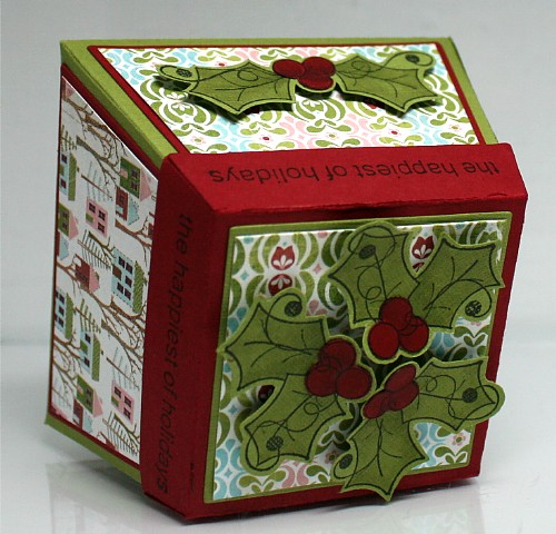 I stamped the holly and berries stamps on SU textured green and cherry cobbler card-stock. Cut the holly and the berries out and colored with Copic Sketch Markers R24, 27,29 and YG91, 93, 95 … I know… it was fun though! Great therapy after a busy day with my awesome Grandchildren! The sentiment is another from the new Merry And Bright stamp set by Amy R. HERE. I stamped it on each side of the lid… yes, I used my stamp a ma jig! I say it every-time, I love all these sentiment sets…I always find something I can use for the project I’m working on! Pattern paper is BG Eskimo Kisses 6×6 pad. Check out the new BG Jovial 6×6 pad for Christmas this year… it’s gorgeous! HERE The box is cut from Accucut dies.