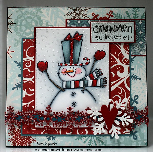 5. Hi Pam and WOW your snowman is so…….cool :D, love him! Your colouring, well, you know it always amazes me and I love all that sparkle too, it’s the perfect Christmas card. You asked a question about the Katzelkraft stamps and yes, they do ship to the USA. Hope you had a good weekend, hugs, Chris 🙂