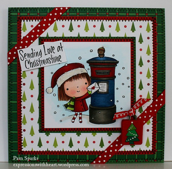 Today’s card is for the Sweet Stop Sketch Challenge Blog.  Mimi is sending love at Christmastime!  I used Penny Black’s Royal Greetings stamp 4096K,  Hero Arts stamp C3159 Sending Love, and the stitching is from a clear set by Sandy Lion – Kelly Panacci Borders KPSTP4.  Mimi is stamped with Memento Tuxedo Black ink and colored with Copic Sketch Markers.  Mailbox blues are B30’s with some warm grays.  Greens are YG00’s and G99.  Reds are the 20’s, 59, E07 and some warm grays.  Hair is E30’s.  Skin E0000, 000, 00, 11. White flower soft on her hat.  The little heart on the envelope is a teeny  heart punch from a Fiskars handheld (paperboy type) heart punch. The tree charm “thing” is from Around the Block,  I think.  It’s old! Probably five years or so! The dark green paper is old PSX (Personal Stamp Exchange)… the tree paper is from American Crafts and I just purchased it this year!  How ’bout that! lol