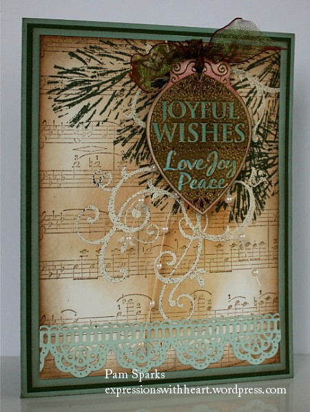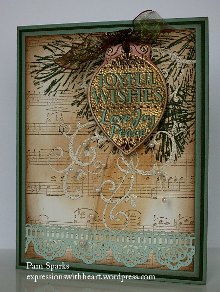 I needed another Christmas card today…made me so happy that I got to try this!!!   I saw a card in Hero Arts Flickr gallery with some of their new stamps and I don’t have them “yet”  so I had to improvise!  I used Hero Arts H2887 Real Pine and the ornament is from a set LL260 Good Cheer Messages.  I did sneak in that Stampin Up Baroque stamp and I think the music background is Penny Black…it was fun to emboss and play  to create this anyway! : )  The paper lace/ruban at the bottom is from Basic Grey Capella.  I edged all the papers with vintage photo and/or walnut stain Distress inks, HERE and the ink blending tool, HERE…can’t stamp without them! lol
