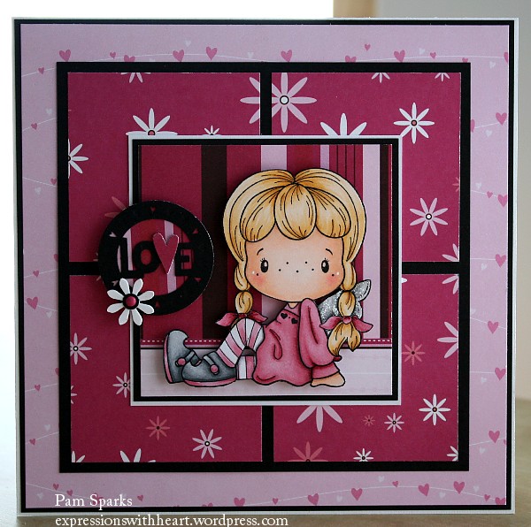 5. Pink !!! Kind of out of your “box”. She is really cute and love the black accents that make the card “POP”. Great card, again. Can we expect more pink for Valentine’s Day ???