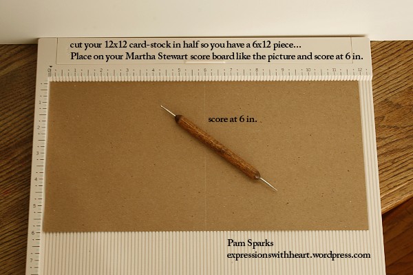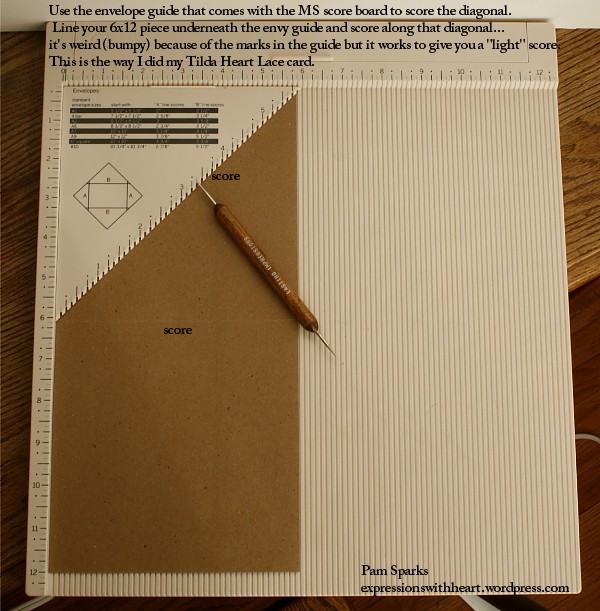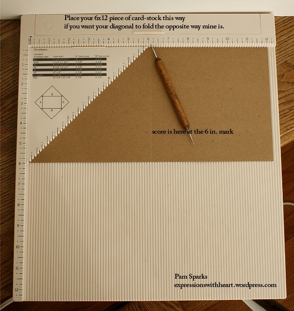 • now you will score your “in half” fold and your diagonal with your bone folder so you have nice, sharp folds and it will look like the next photo