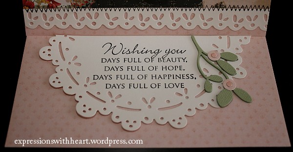 5. What a gorgeous card! I love that DCWV paperstack – Mariposa. It works so beautifully with the image also. I have been trying to find this in the 8 x 8 paperstack without much luck. The mat size always stumps me too.