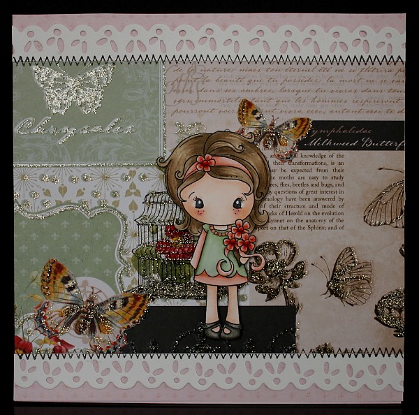 12. What a wonderful card. Image is colored beautifully and all the embellies and DP are gorgeous. The sparkly butterflies seem to be fluttering off the page. Very creative card and that die is perfect.