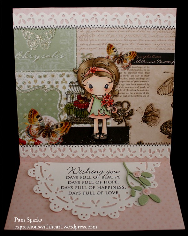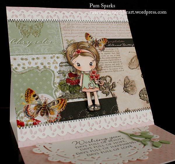 6. Love the butterfly paper! All the dies just add so much to the card Pam! Your image is adorable love her green and peachy color!!! (Notice I did not mention any names)!!!!! LOL