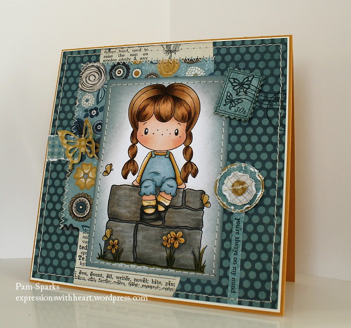 8. This is simply too adorable Pam !!! The way you color hair just amazes me with your perfect color tones & highlights. LOVE those tiny sentiments & that wonderful rock wall she’s perched on …