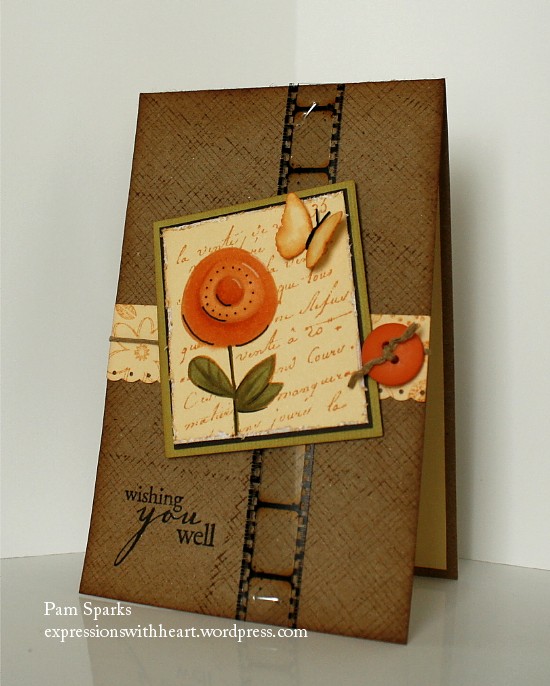 8. Wow Pam, I think this is amazing! Everything works so perfectly together! The orange works great with the Kraft and the filmstrip is a great accent behind this beautiful flower and butterfly. Very unique and oh so clever!! Thanks for playing along in my That’s Krafty Thursday challenge! {{{hen hugs}}}