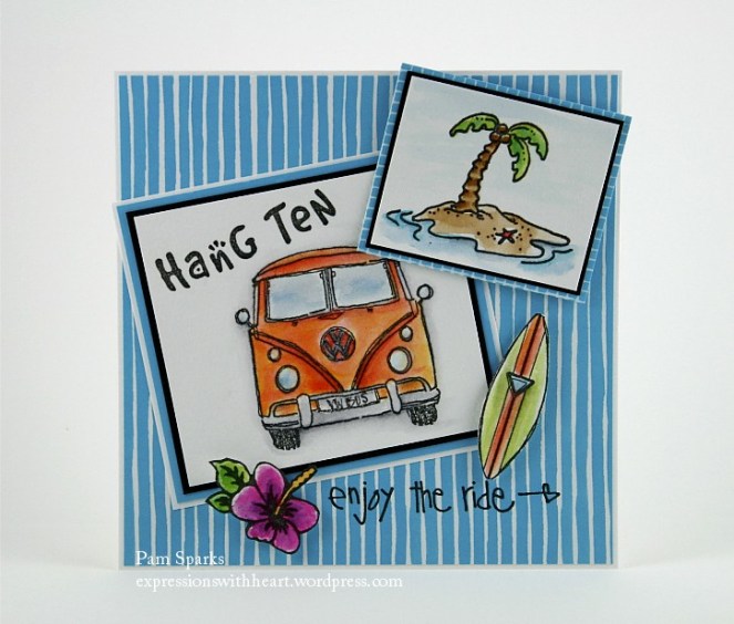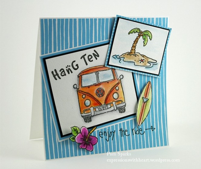 1. You put everything together so well Pam – it is always a good thing when someone’s card puts a smile on your face! I haven’t see a VW van in a very long time!!! And I have never been on a surfboard. But I can dream!!!