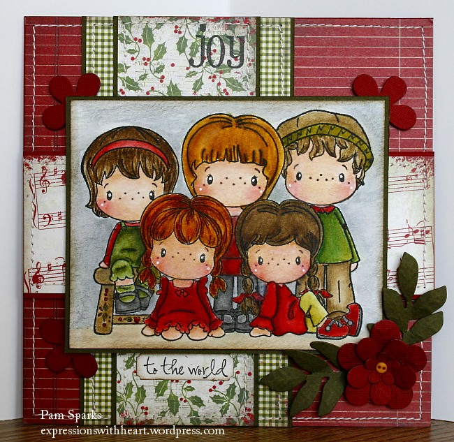 This is the cutest group of kids! Great job coloring with your DIs. Love the combination of papers you used and flower you made! Beautiful Christmas card, Pam! hugs, Angela