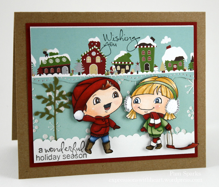 Pam, You did a fantastic job coloring your images and they are just so adorable. Great idea with the placement of your paper for the scene of the houses and I love how you cut the paper to look like their is some snow in front. This is another one of my favorite ones.