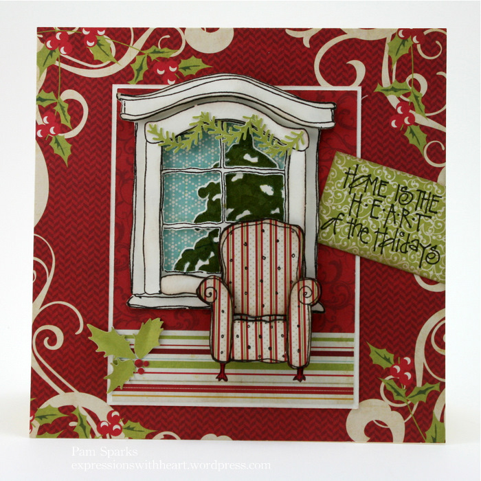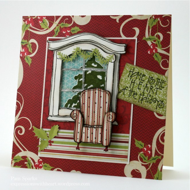 I love this Printworks chair… the third time I’ve used it and the second time for this Printworks window that I love too! HERE, HERE AND HERE. All the stamps I used are from Printworks. The pattern paper is from the Echo Park 6×6 pad called Season’s Greetings. The Chair is paper pieced. I edged the pieces with Distress Walnut Stain ink and the ink blending tool. I think this living room type scene could be for any time of year! Happy 2nd day of 2012 to you and yours! Hope you don’t have the biting cold wind that we have here in Iowa! Brrrrrr. Wish I didn’t need to go out today! Hip hip hooray this card is done though!!! lol