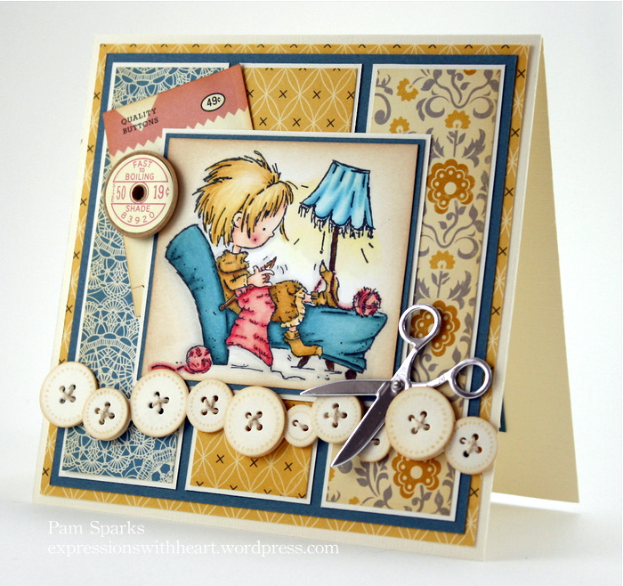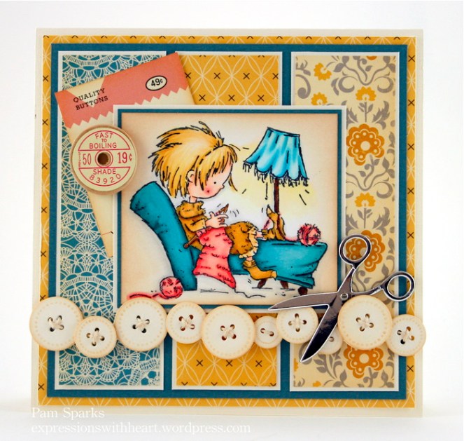 5. Pam, what a sweet card. Daisy looks like she’s having fun knitting (one of my hobbies too!). Your coloring is amazing (as always!). Love the button border and how you made the die-cuts look like real buttons by layering them. Great idea!