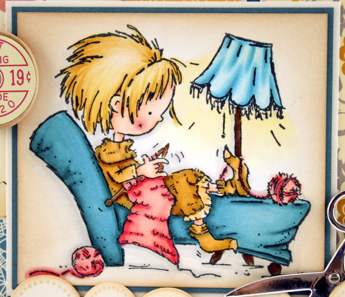 I can hear those needles clicking!  Two of our daughters knit and they make gorgeous things!  When I saw this image I loved it!  wonder what I was thinking though… none of our three daughters have blonde hair!   This is dear Daisy, from Marianne Designs Don and Daisy clear stamp line.