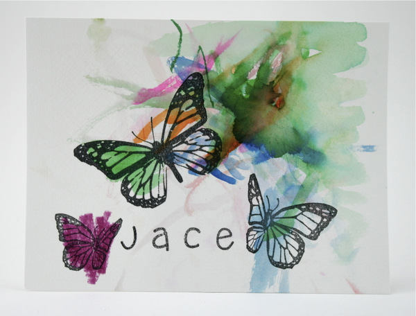 Jace used AmyR Stamps Butterfly Sentiment set… I stamped them because it had to be waterproof ink and it’s on watercolor paper. Into the art museum a.k.a. mom’s smash book! lol