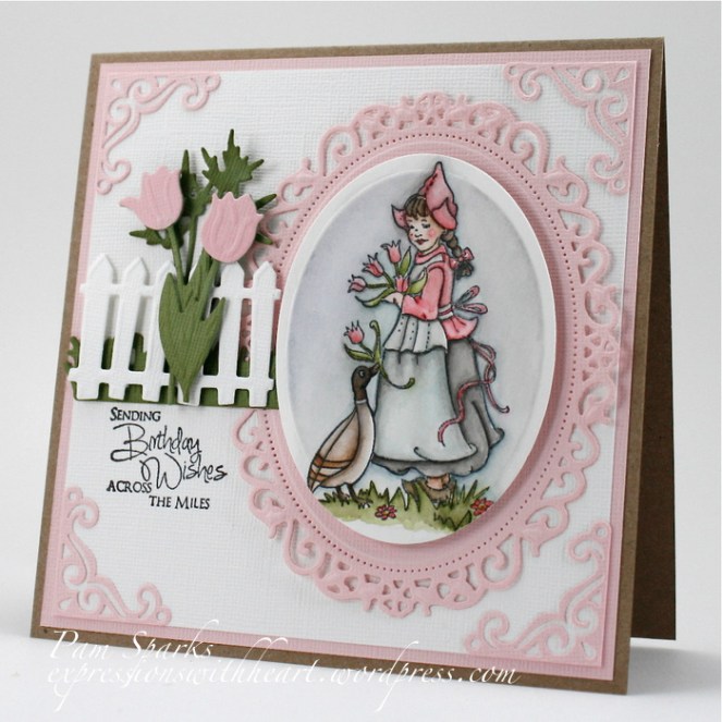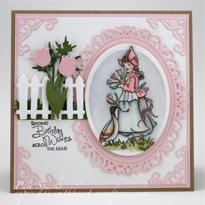 5. OMG, Pam, I loooooooooooooooove this gorgeous card!!!!! Such a darling image and those tulips are absolutely phenomenal! Well, you know I’m going to have to buy this die now!!!! You are such an enabler!