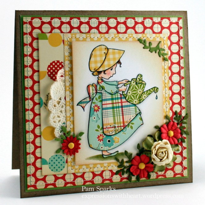 2. Pam this is just too cute … LOVE all the paper piecing of that adorable little image. Added to that the sweet little flower centers & you have created another one of a kind creation like only you can do.