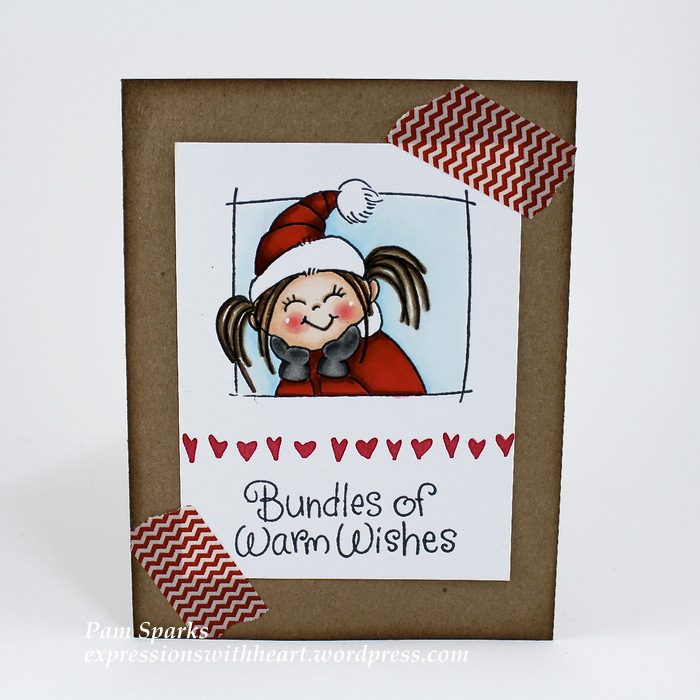 Another cutie Kiddo from Stampendous!  Love her smile!  Washi tape from My Minds Eye and the row of hearts from Printworkscollection.com…  She’s stamped with Memento Tuxedo Black ink on Hammermill 80# cover color copy paper (scroll down in my posts for links)  and colored with Copic Sketch markers!  oops!  Just realized I was going to finish coloring her.  I colored her while I was watching grandkids and with my granddaughter’s limited color selection of markers… I was going to blend and finish at home and completely forgot until I looked at my photo… oh well,  you will give me coloring grace this time, right?! hohoho