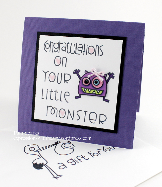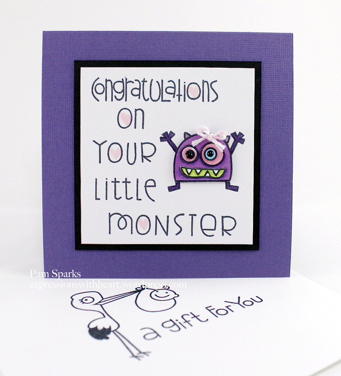 I stamped several monsters, cut, layered and colored with Copic Sketch Markers.  ‘Congratulations’ is from the PS Sentiment Sampler.  I used the PS Alphadot set to stamp out the rest of the words on the front.  The stamps on the envelope are from the PS Birthday Sampler and PS Pip Squeaks sets.  On the inside I stamped a sentiment and bear from the PS Pip Squeaks set… it says, “to a super cute family”.  I forgot to take a picture of the inside.  Thought it was an adorable sentiment though! : )