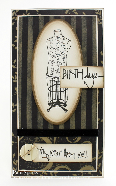 This is one birthday sentiment that is encouraging!  Printworks stamps and double sided pattern paper…an old button and hemp.  Some May Arts black velvet ribbon.