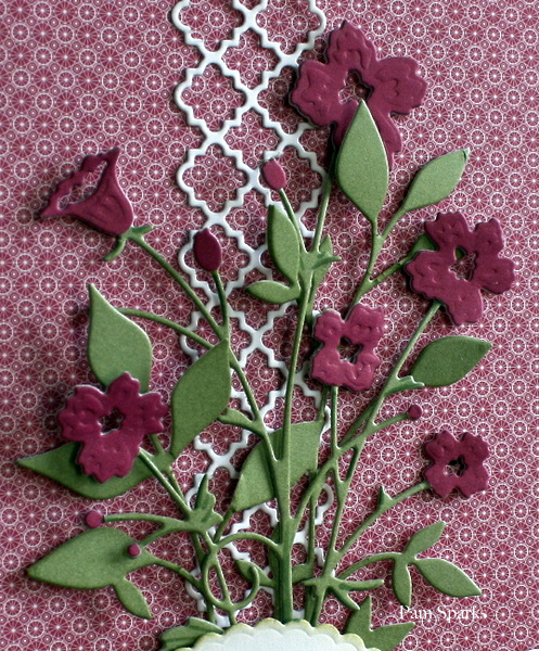 Lovely Bella Bouquet die…delicate lines and embossed flowers…an awesome die! I paired it with Fresh Foliage then added one of the Pastry dies and the Tessatina Border. The text ‘flowers’ is part of a new Memory Box stamp, inked with Peeled Paint Distress ink! Sneak Peak! : )