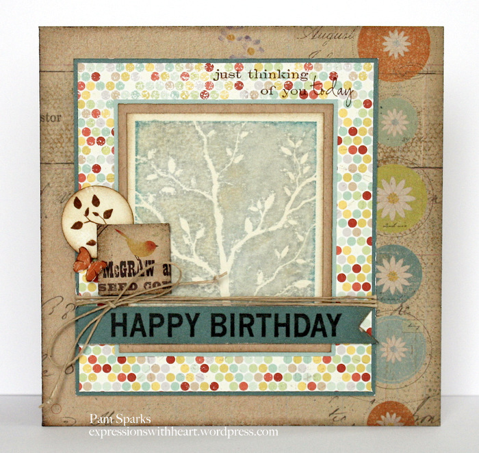 For this card I used the NEW Branches Background stamp, the NEW Just Thinking of You Today stamp and the top line from the NEW Happy Birthday Background stamp.  I used the Spring Branch stamp on the MB parchment card-stock, punched circle.  The sentiments and branch on the circle are stamped with Memento Rich Cocoa ink.