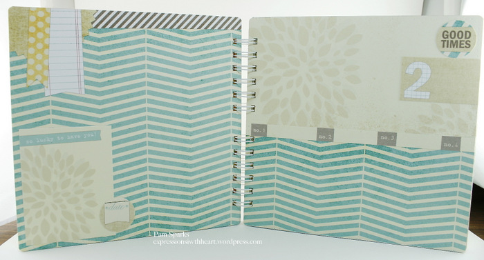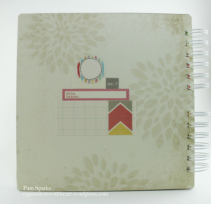 Here’s the chipboard album!  I cut the 12 x 12 sheets down to 8 x 8 and had 4 x 8 pieces to use too!  Lots of Elle’s tags, circle tags and labels on the pages.  I ran around the edges of each page with the cutter bee piercing tool, pulling it on the 1/8th inch line of the Martha Stewart scoreboard.  The album is bound with 1 inch Bind it All wires.