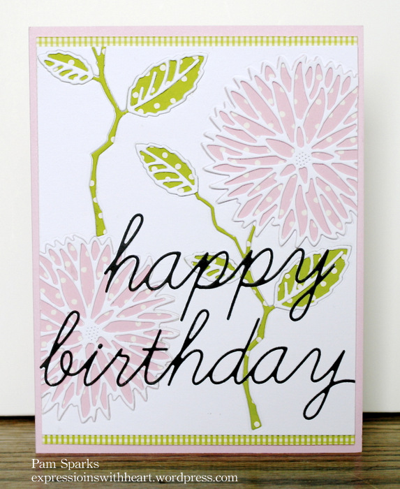 Happy Monday everyone! My Chrysanthemum Happy Birthday card features the new Chrysanthemum Outline die, Chrysanthemum Background die and Happy Birthday script dies.  I used the Dogwood Blossom Outline die and Dogwood Blossom die for the stems and leaves.