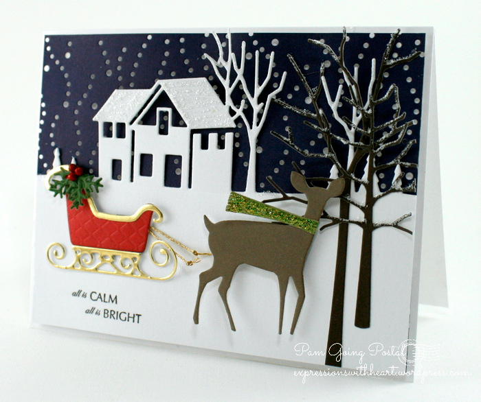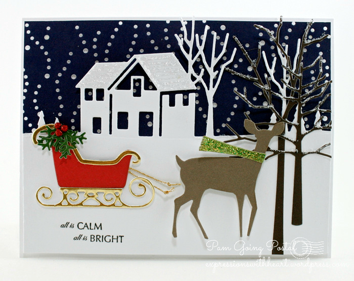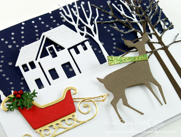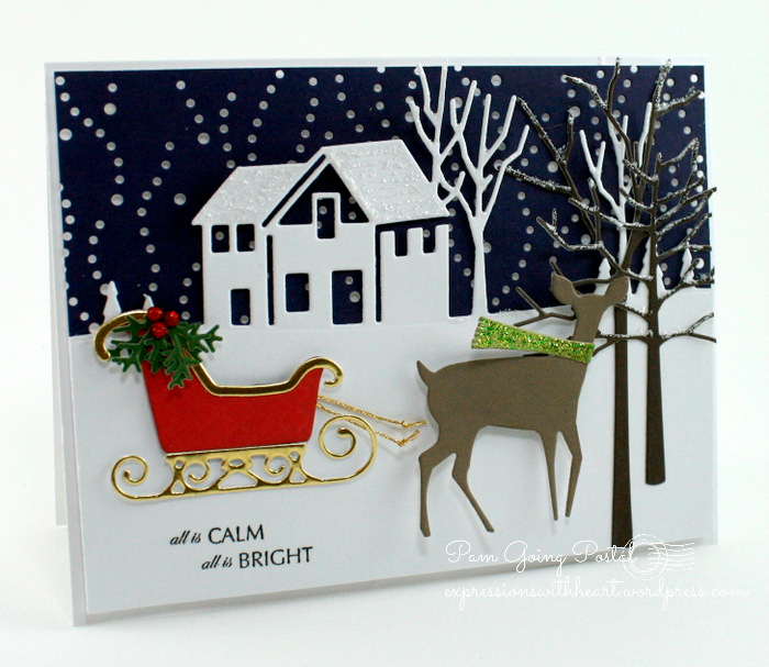 There…you can see the embossing on the sleigh in this photo!  So cool!  I combined the new Poppystamps dies, Santa’s Magic Sleigh, Small Garden Sprig, Woodland Fawn with Memory Box ‘All is Calm’ stamp, Winter Cabin Landscape, Bare Sapling, Twiggy Tree and Silent Snowfall.