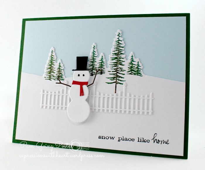 Meet Poppystamps Bundled Snowman stationed in front of the Country Fence and Mountain Top Trees stamp and die set.  The sentiment, snow place like home, is from Memory Box.