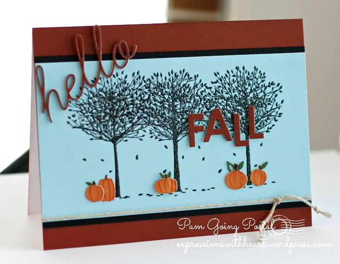 Ahhhh……My Memory Box card fix of the day!!! Thank you! Your talent is so amazing! I love how you bring paper to life! The 3 simple trees are spectacular; but, the single falling leaves and the leaves on the ground are just fabulous. The pumpkins are the perfect addition and the color combo ROCKS. So very nicely done Pam! Thanks so much for sharing with us.