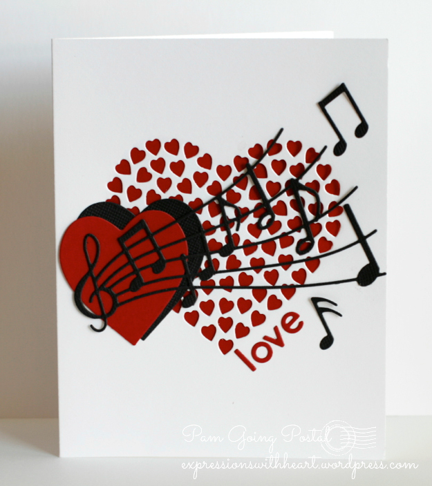 Here I used the NEW Party Music, Musical Motifs, Heart of Hearts, Sweet Heart, Queen of Hearts and Alphabet Soup dies. (I just used the heart cut from the center of the Queen of Hearts die)  I cut the Cupid Heart out of red card-stock and it is glued on the inside of the card behind the Heart of Hearts that is cut directly in the white notecard.