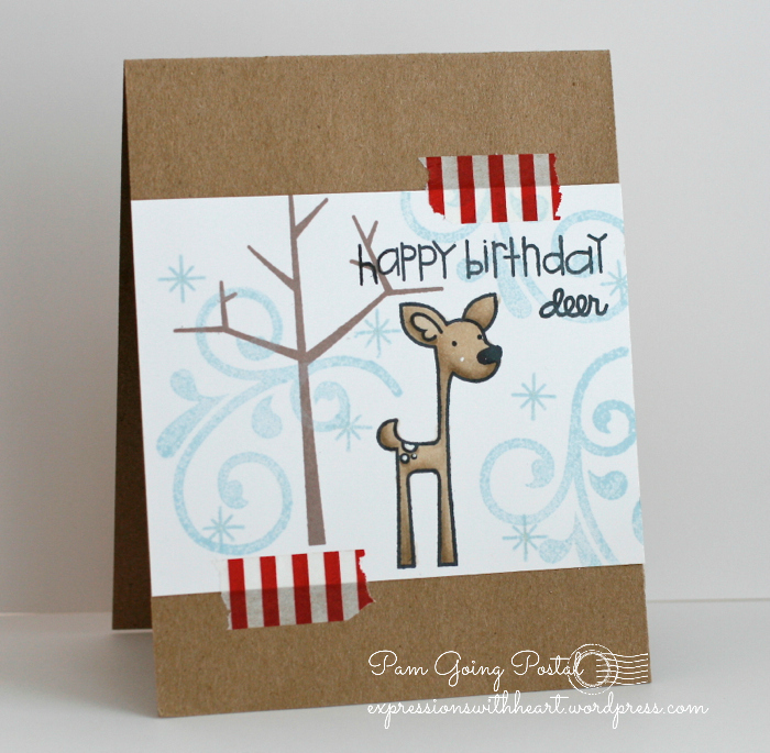 I wanted to get in on the Paper Smooches Sparks Challenge Blog Anything Goes post.  This is a birthday card I made for Tim.  I saw one of the PS designers using this flourish for a snow look so I had to do it too! Stamped with Tumbled Glass Distress Ink.  Perfect for a January birthday! Colored with Copic Sketch Markers.  Right now ‘deer’ aren’t so ‘dear’ to me though.  Hit one with my car in July and did a lot of damage.  I just like the stamp and paper cute ones now!!!
