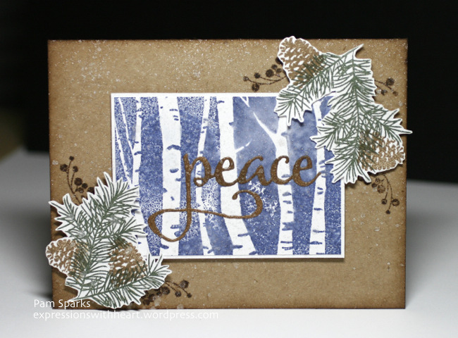 After I mounted the branches on foam squares to the card base, I glued on the die cut word Peace, I die cut it in white and inked it with Distress Gathered Twigs ink, then spritzed everything again with Sparkle and Frost Sprays.